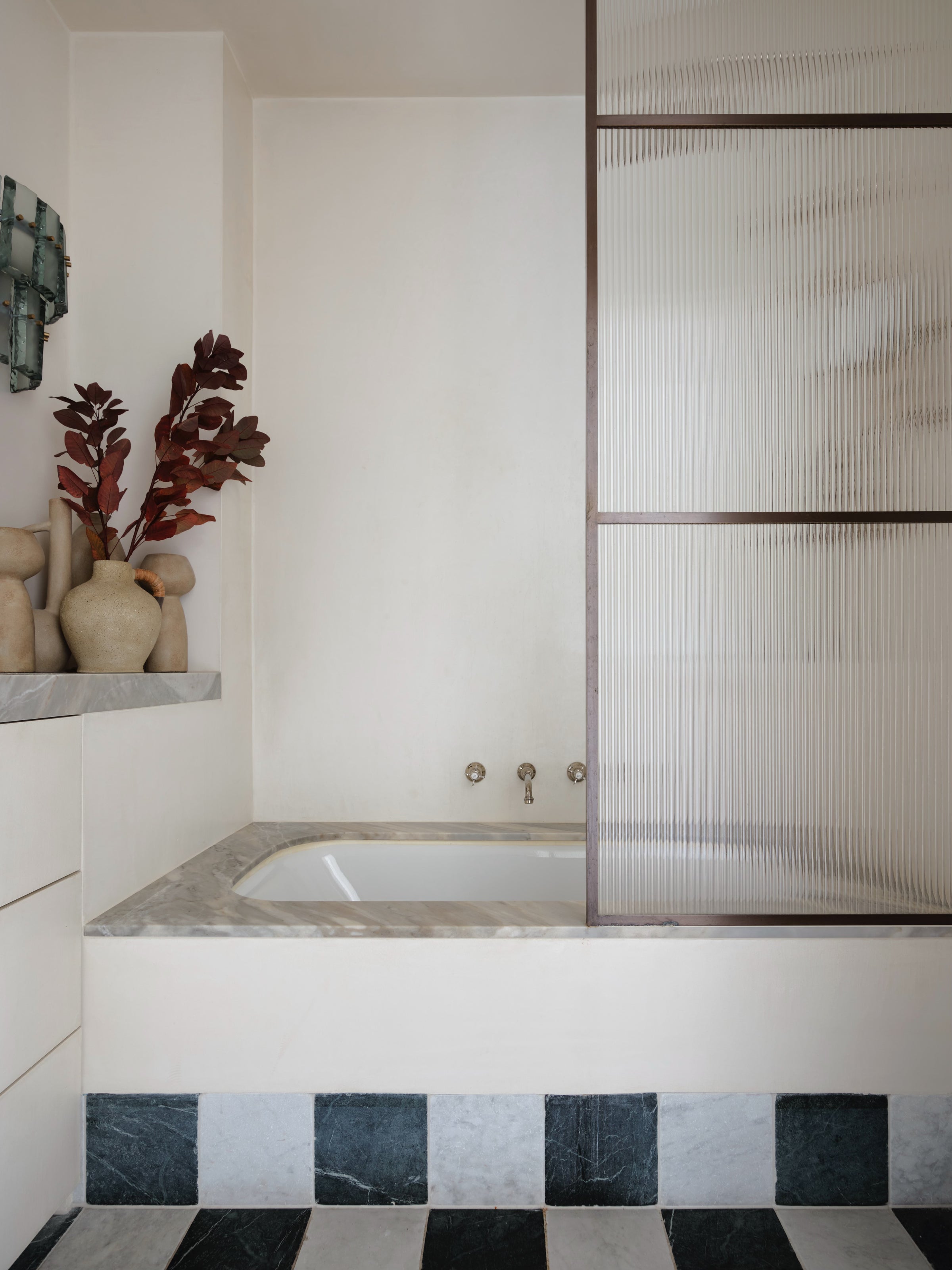 In the two bathrooms, where Johnson was directed to create his and hers versions, she created cohesion by using the same slate grey shade of grey marble across both. An abundance of natural light gave Johnson license to use lighting sparingly, choosing artful and vintage pieces to bring character to each room.